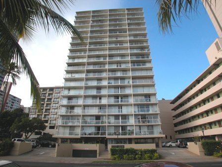 Return to www.myhawaiicondo.com DESCRIPTION: Built in 1973, 2233 Ala Wai is a Fee Simple condominium, 17 stories high-rise building with 51 units in one bedroom/one or one bedroom/one & half baths and two bedrooms/two baths models. One parking stall conveyed with each unit plus 5 for guests parking. Amenities include heated swimming pool, recreation area and storage. SECURITY: Secured entry requiring pass key, keyed elevator, video cameras. PETS: Yes, verify with resident manager concerning their latest House Rules with regards to size, type and number of pets. SUPERMARKETS: Food Pantry - 2370 Kuhio Avenue, Safeway - 888 Kapahulu Avenue. REGIONAL MALL: Ala Moana Shopping Center - 1450 Ala Moana Boulevard. PUBLIC SCHOOLS: Jefferson for elementary, Washington for intermediate and Kaimuki for high school. COMMENTS: One bedroom units in 2233 Ala Wai have a little over 800 sq. ft. of interior living area plus open lanai. Two bedroom units have approximately 1,024 plus spacious lanai. Owners are permitted to having window mounted air conditioners. Upper level units have unobstruct golf course, canal and mountain views. Monthly maintenance fee includes electricity, gas, hot water, water and sewer plus other common expenses.
