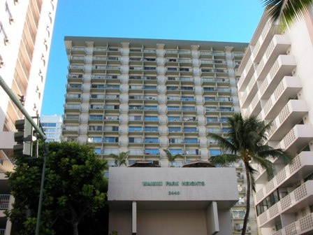 Return to www.myhawaiicondo.com DESCRIPTION: Built in 1974, Waikiki Park Hgts is a 24 stories high-rise with a total of 269 Fee Simple units. Floor plans include one bedroom/one bath and three bedrooms/one bath. Some units are conveyed with a parking stall. Amenities include wimming pool and community laundry. SECURITY: Secured entry, keyed elevator, security patrol. PETS: Not permitted. SUPERMARKETS: Food Pantry - 2370 Kuhio Avenue, Safeway - 888 Kapahulu Avenue, Foodland - 2919 Kapiolani Boulevard. REGIONAL MALL: Ala Moana Shopping Center - 1450 Ala Moana Boulevard. PUBLIC SCHOOLS: Jefferson for elementary, Washington for intermediate and Kaimuki for high school. COMMENTS: Waikiki Park Hgts is located close to Waikiki Beach and shopping arcades. Recreation deck on the 23rd floor, provides a panoramic view of Waikiki. Furo (Japanese style) baths were originally installed in the units. Maintenance fee includes AC Central, cable TV, electricity, hot water, water and sewer.